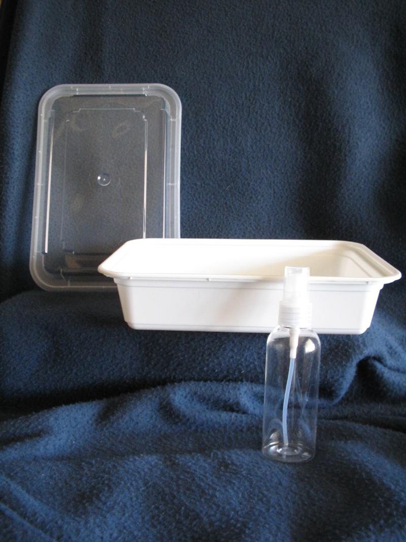 These affordable plastic dishes with covers can be found in most any grocery store. Another necessary item is the plastic sprayer bottle. Also easily found in most large grocery or hardware supply stores. A fine mist sprayer is preferrable over the larger, more coarse sprayers intended for misting plants. Simply spray the "palette" every few minutes in warm climates, and snap the cover on to keep paint moist and usable for extended periods.